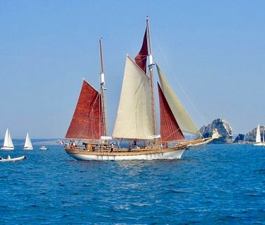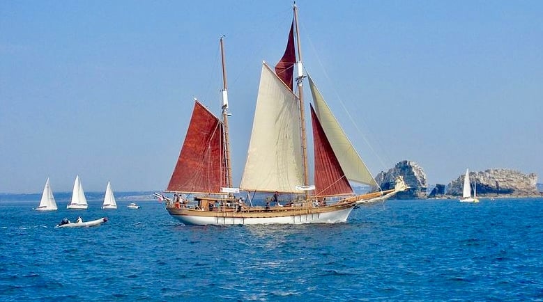 De là, une destination à la journée s’impose, découvrir la magnifique île de Groix, tranquillement, poussé par les 7 voiles du gréement de Bora Bora. Pour manœuvrer cette cathédrale de voile, deux marins agiles nous ont rejoint pour toute la saison.