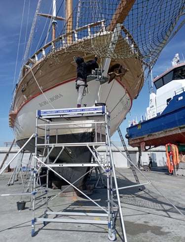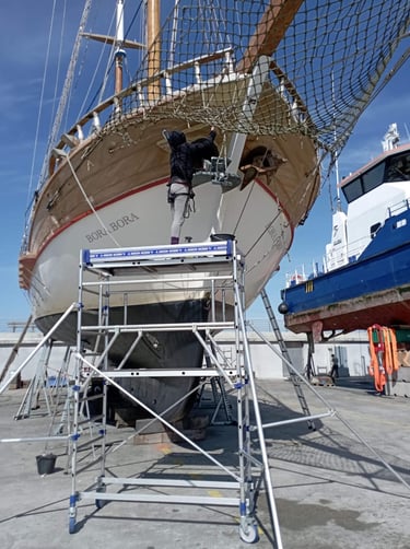 Quelques mois de chantier à flot à partir de Janvier 2023 près de ce joli petit port authentique, puis à terre en avril au port de pêche de La Turballe, ont permis à Cécilia avec une équipe de famille et copains bénévoles de rendre les soins nécessaires à ce colosse un peu seul et ennuyé depuis 3 ans de repos dans la rivière la Vilaine.
